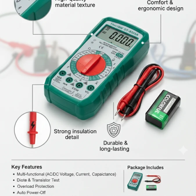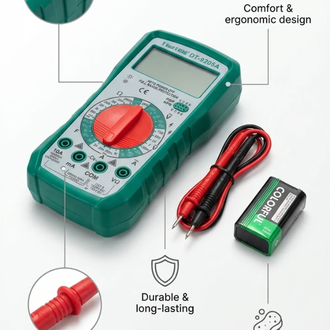 Que vous soyez un électricien chevronné, un passionné d’électronique ou un bricoleur exigeant, le DT-9205A est l’outil de mesure indispensable pour diagnostiquer, réparer et sécuriser toutes vos installations électriques. Alliant robustesse et haute précision, ce multimètre polyvalent vous accompagne dans tous vos projets, du simple test de pile au dépannage de circuits complexes.