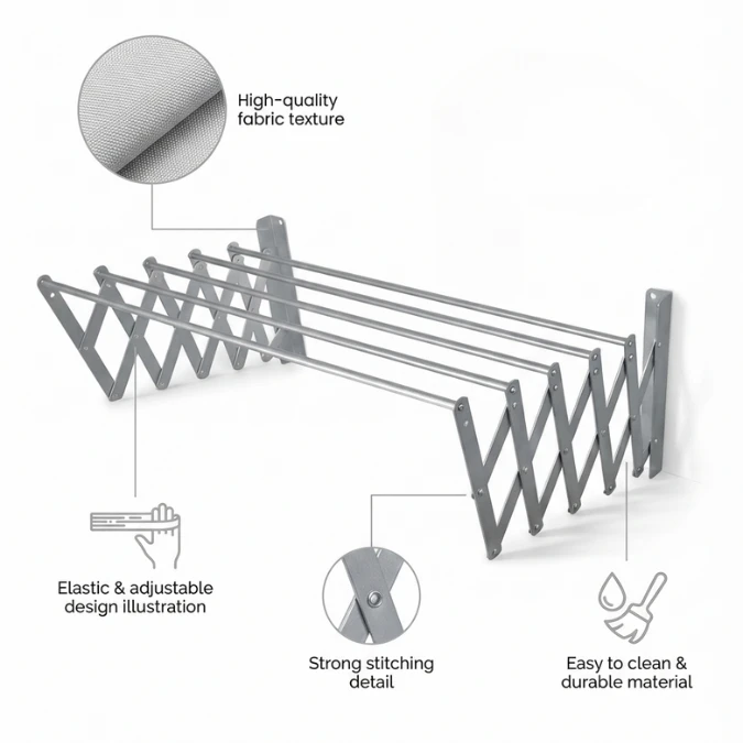 Grâce à ses quatre points de fixation murale, il s’installe rapidement et convient parfaitement aux petits espaces comme les salles de bains, buanderies ou balcons. Il offre une surface d’étendage suffisante pour les vêtements du quotidien ainsi que pour les textiles délicats. Sa finition gris métal, sobre et moderne, s’intègre harmonieusement à tout type d’intérieur.